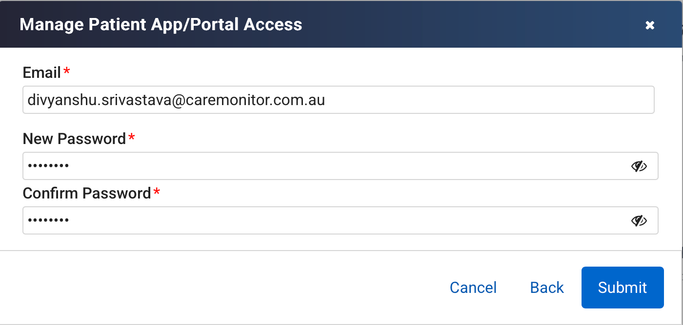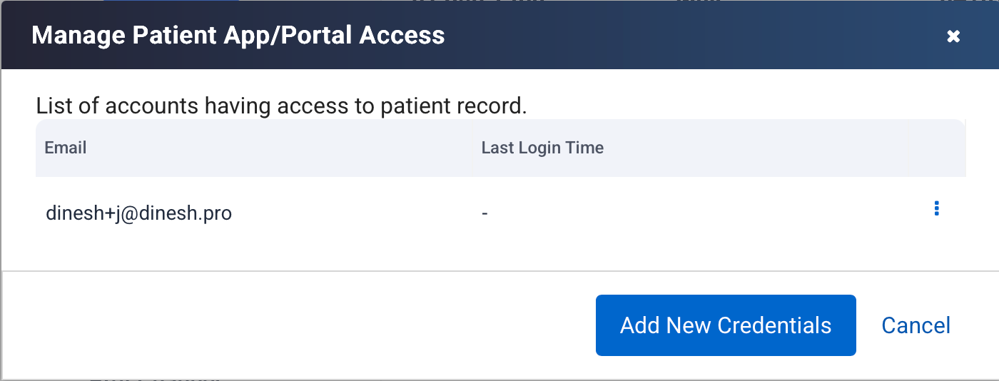 2. Add New Credentials: Admins can easily add new login details (email and password) for patients who need them, helping streamline onboarding without long support calls.