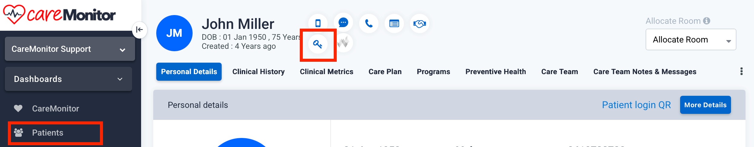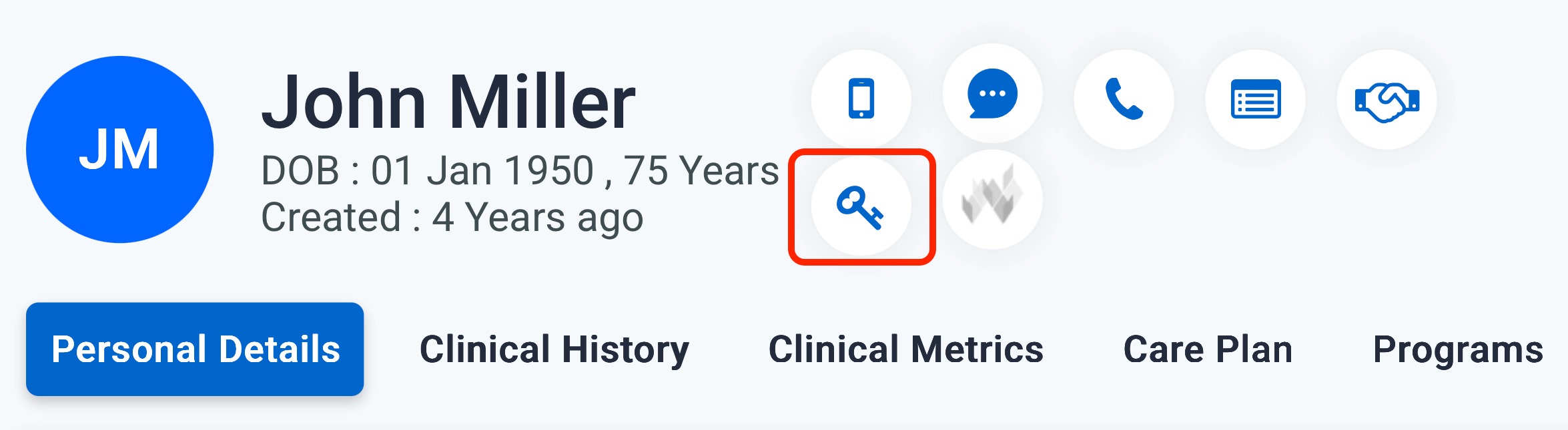 - Initiate Access Management: Click the Key icon (labeled Manage Patient App/Portal Access).
